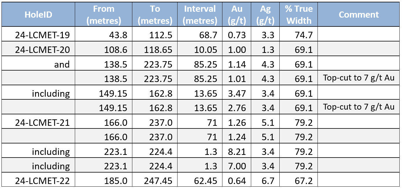 Heliostar CEO, Charles Funk, commented, “The turnaround at La Colorada has been a real strength for Heliostar. In the three months since the acquisition, the Company has restarted production and established a mine life of 6.5 years. This drill program has returned a powerful combination of wide gold intervals and high-grade veins, leading to our expanding the program to a total of 104 drill holes. The intervals reported to date are intended to drive stronger economics in an updated technical report planned for mid-2025. A new drilling program at La Colorada will now focus on defining additional mineralized material from historic stockpiles, which we believe can quickly be brought into production. We will then pivot to exploration for underground targets in the second half of the year.”