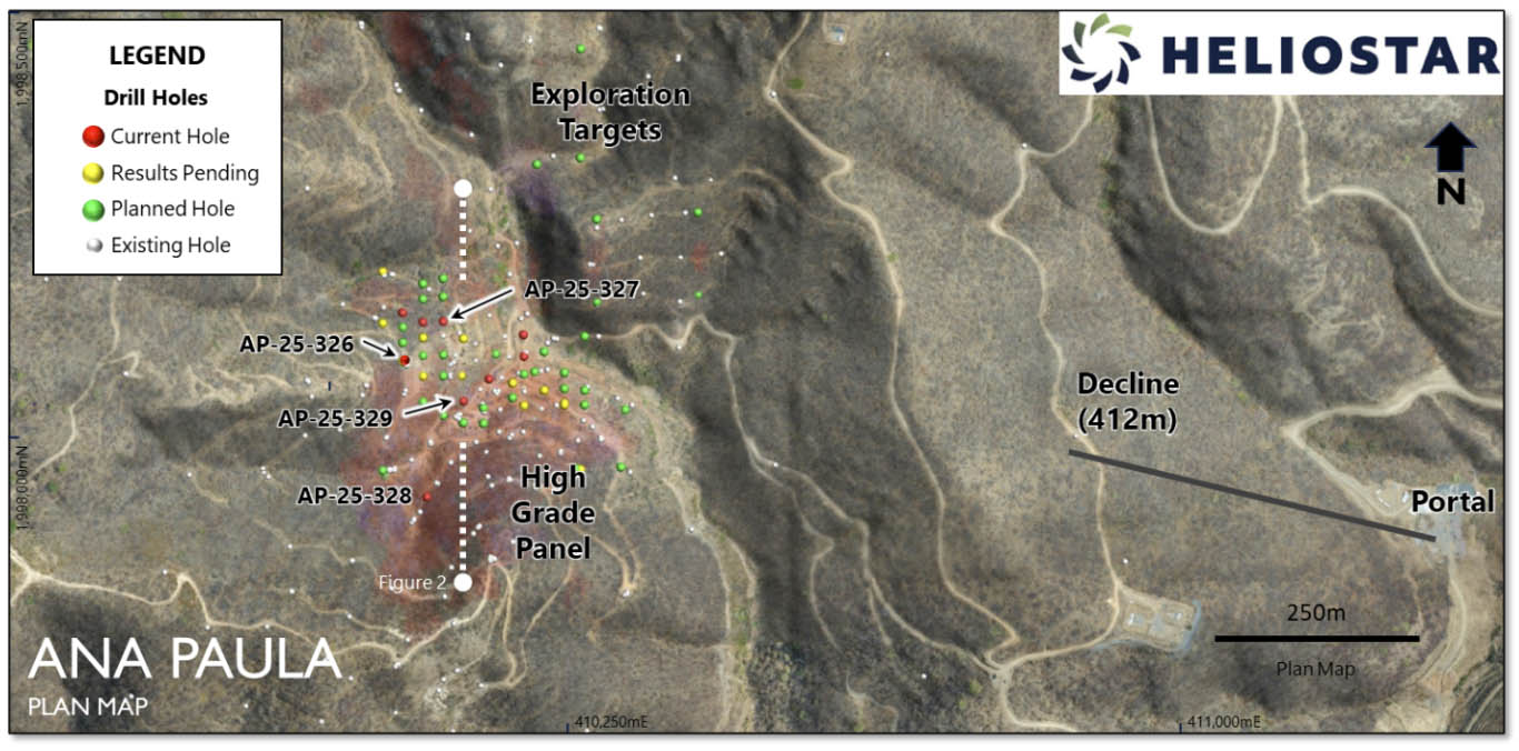 Heliostar CEO, Charles Funk, commented, “The drill results from the ongoing Ana Paula program continue to provide exciting results. The infill-focused drilling consistently returns broad, continuous intervals of strong grades as expected and - in some instances - hitting higher grade material than is currently estimated in the block model. We intend to make a construction decision for Ana Paula on the back of a Feasibility Study that will allow us to have the mine in production at 100,000 ounces per year in 2028. Our comprehensive plan to de-risk the deposit is ongoing and includes collecting additional technical data beyond assays that will help us design the mine. We are pushing hard toward this goal and, as such, have mobilized a third drill rig to the site in order to compress the timeline as much as possible. I see Ana Paula as a foundational asset of the high-quality mid-tier producer we are growing towards.”