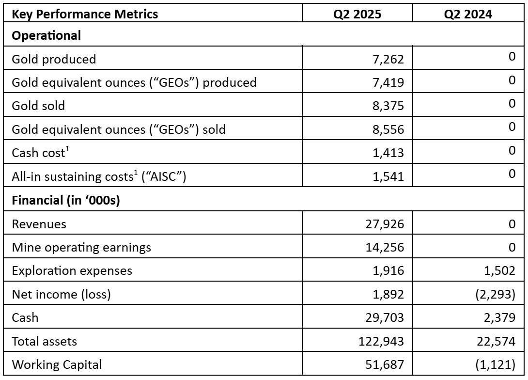 Mine Operating Earnings of $14.3 million in Q2 2025. The Company continued to report strong results in Q2 2025, with continued improvements in operating performance, as well as benefiting from selling into a rising gold market. Mine operating earnings YTD 2025 are $26.1 million.