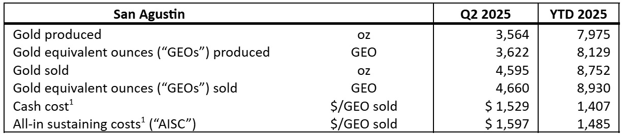 Total gold production of 7,396 gold equivalent ounces ("GEO") (7,262 gold ounces) in Q2 2025. Gold production was realized from mining the Junkyard Stockpile at the La Colorada mine, as well as re-leaching the previously stacked ore at the La Colorada and the San Agustin mines. Consolidated production also benefited from a nominal contribution from residual production from the rinsing of residual leach pads at the El Castillo mine. Production year-to-date ("YTD") 2025 is consistent with the 2025 guidance issued by the Company on February 4, 2025, which remains unchanged.