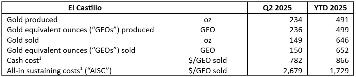 Gold production of 7,396 GEOs (7,262 gold ounces) for Q2 2025 was reported from the La Colorada mine and the San Agustin mine, with a nominal amount reported from the El Castillo mine, which has commenced reclamation. The combined YTD 2025 production of 16,477 GEOs of gold (16,039 gold ounces) is consistent with the 2025 guidance issued by the Company.