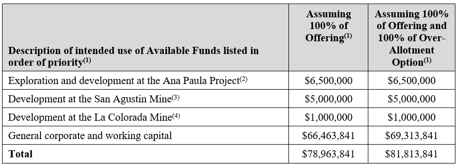 The Company intends to use the net available funds from the Offering (the “Available Funds”) for exploration and development of the Projects, and for general corporate and working capital purposes.