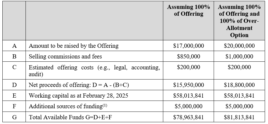 The following table provides a detailed breakdown of how the Company intends to use the Available Funds: