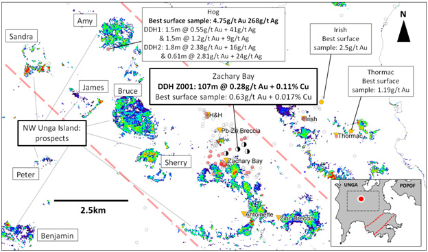 The satellite mapping technique, executed for Redstar by Dr Marc Goossens at Geosense NL, shows strong correlation of siliceous, clay altered, goethite & jarosite bearing systems with porphyry gold + copper mineralization in the Zachary Bay project area (1975 DDH Z001: 107m @ 0.28g/t Au +0.11% Cu), and with epithermal gold + silver vein targets at several outlying prospects including Hog (1983 DDHs 01-83: 1.5m @ 0.55g/t Au + 41.8g/t Ag & 1.5m @ 1.2g/t Au + 9.6g/t Ag and 02-83: 1.8m @ 2.38g/t Au + 16.5g/t Ag & 0.61m @ 2.81g/t Au + 24.7g/t Ag). It also defines seven further, kilometre-scale systems that have not yet been systematically explored.