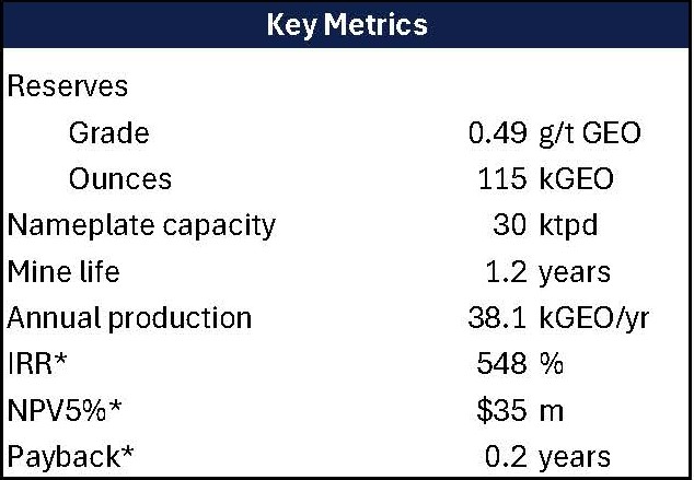 The technical report outlines 44.5koz of gold produced over a 14 month mine life at an AISC of $1,605/GEO, benefiting from a LOM strip ratio of just 0.9:1.The study shows an initial capex of $4.15m, but including land payment and the initial working capital requirements (mainly the inventory build up on the pad during the time lag between stacking ore and initial recovery of gold),management is projecting a ~$10m total outlay to get the mine back into commerical production.