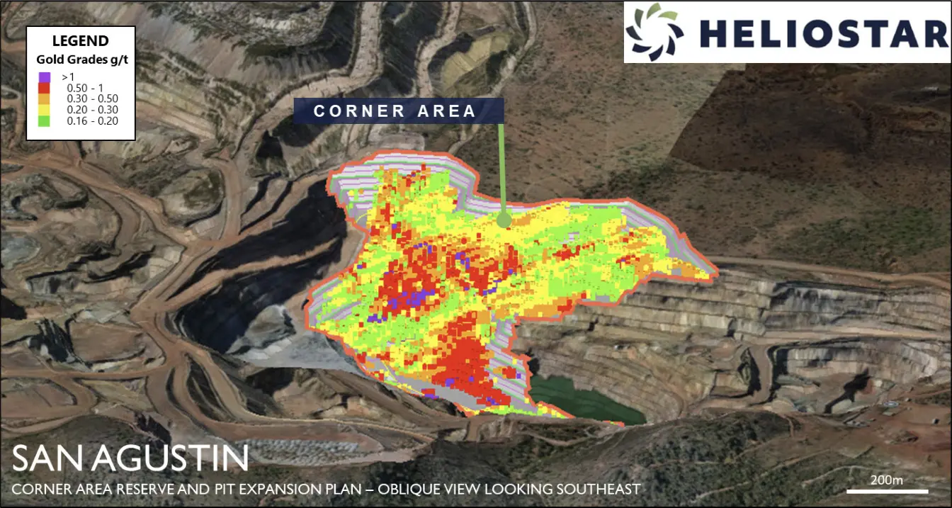 The mine currently produces gold from re-leaching ore already on the pad. Heliostar's 2025 technical study shows a plan to put the mine back into primary production from mining the Corner area. Argonaut Gold did not mine this area due to the lack of a land access agreement with the landowner, however, Heliostar has reached an agreement to purchase the land from the current owner. The company has recently acquired all permissions required for this pushback and expects to be producing gold from the Corner area starting in4Q 2025.