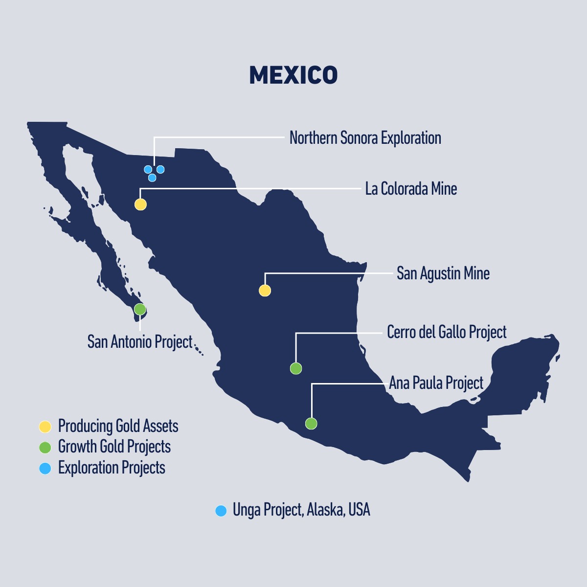 The San Agustin mine is located 100km north of the city of Durango in the state of Durango, Mexico. The open pit heap leach mine is situated on a 5,884-ha land package. It is currently in production from residual leaching of material on the pad but with a plan to restart mining later this year from the Corner area. This will provide 14 months of mine life producing 44.5k GEO with opportunities to extend production through exploration.